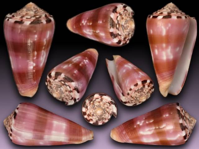 Large, attractive and strongly pigmented color deluxe cone from the romantic north French Polynesia. The shell shows a sharp shoulder, beautiful pattern on the perfect spire with classic dark/light lavender and faded blush/violet banding complemented by one complete central band of egg-shell white longitudinal flammules to the ventral and leading body whorl to the lip edge. Flammules are absent on the mid-dorsal. Excellent wide shape and form with an intact protococh, spire, sharp lip and anal notch. Collected by Scuba diver while buried in sand under rocks at 30-40 meters off Ua Huka Island, Marquesas in 3/2025. The specimen shows a mini/ subtle growth crease mid-dorsally at the shoulder and a micro-nick on the lip toward the anal notch. Grade: F+++/GEM minus.