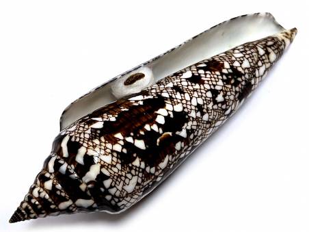 NoteXFB 10 - Conus (Cylinder) bengalensis (Okutani, 1968) BEST SELECTION WITH DARK UNIQUE PATTERNS !!! (less specimens are found Andaman Sea recently due to limited fisheries!) 120.00 mm, F++/F+++, few small problems here and there, see photos, rare W/O. Trawled at 80 - 100 meters deep offshore of area between Racha - Pee Pee Is., Phuket/Krabi province, Thailand, Andaman Sea, found near the end of December 2025 to early pf January 2026. EX : COLL. Jom Patamakanthin. (***There can be tiny imperfections, scars, damages as natural objects, please bids with your decision & confidence.) Estimated value between 30.00 - 50.00+ euros for such specimen!