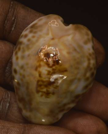 NoteFINE+++, This stunning Cypraea teulerei shell radiates natural elegance with its smooth, porcelain-like surface and distinctive spotted pattern. look like a tree, The shell boasts a high-gloss finish, with a beautifully domed back in shades of warm beige, mocha brown, and deep caramel. Live collected, Found in low tide November 2025.