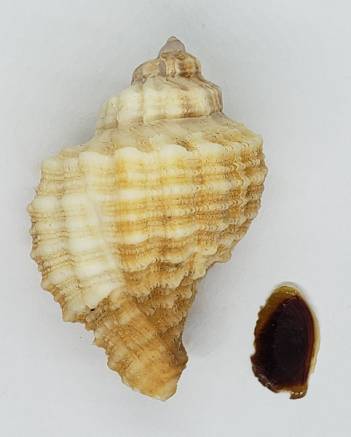 NoteOne very nice specimen of Xanthochorus cassidiformis collected alive among rocks at low tide. This species is rather uncommon and their shells are found usually very eroded. This is a particularly nice specimen, with a higher number of axial ribs on the last whorl (more than double than normal X. cassidiformis), squamose sculpture, a nice pale pink color of aperture, and retaining its original operculum. A low price for an excepcional and endemic species from the SE Pacific