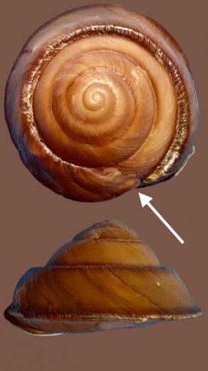 NoteSelf Collected. Under logs and fallen palm fronds in rainforest. Queensland, Tamborine Mountain, Tamborine Mountain Road. 2005. Note: Growth of shell interrupted where indicated one full whorl before aperture which has caused a step at the suture and reduction in height.