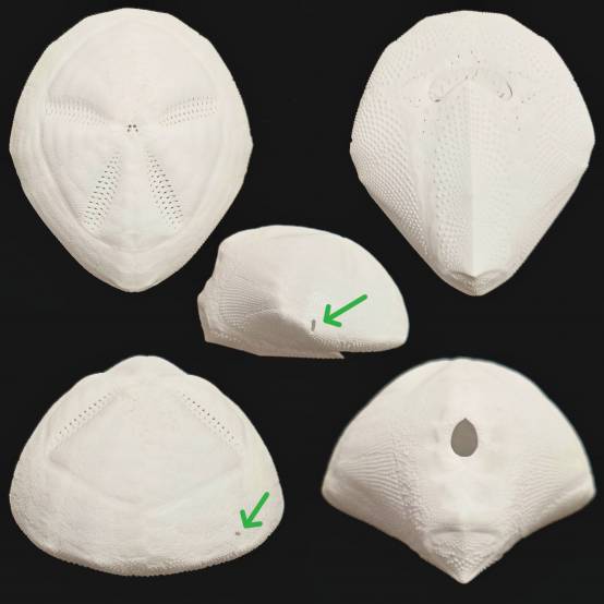 NoteF++ Good size well cleaned specimen. Very nice sculpture. Two small holes as marked by green arrow, else perfect. The mouth plates (peristome plate) are fully intact (rare). The test is thin and easily broken for this deep water species during trawling. Trawled by fishing boat in 150-200m deep, 20 Dec 2007. Not a perfect specimen but if you don't mind the very small holes, it is still a very lovely specimen with the rare mouth plates intact. Starting at a very low price to give this specimen a chance to rest in the next good home. A smaller but perfect specimen of this species was sold in March auction for 106€. It is a bargain deal for this specimen at this low starting price.