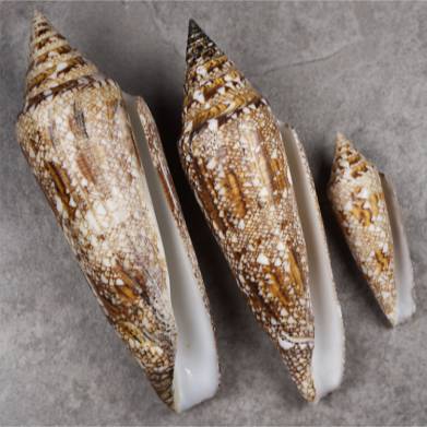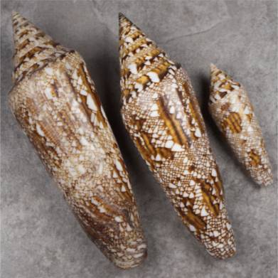 NoteAn impressive large Conus bengalensis which is unusual in three ways: the shell has a very fine tent pattern. The pattern near the siphonal canal is exceptionally dark. The shell is unusually broad on it’s base with a wide aperture. Small growth line on lower base, not harming the beauty. Unusual Conus bengalensis are rare: most shells resemble other shells, so this piece will attract attention of your fellow Conus experts. It’s a shell worth being figured in books and it’s worth a famous museum. We join a normal piece and a young shell. Young shells are also uncommon, they glide through the nets. This fine bengalensis was an excellent catch, and it’s unique. Delivery including the two extra pieces. 126.3 mm., 61.7 mm., 119.1 mm. Thailand. Adaman Sea. Off Racha Island. Trawled 80-120 m deep. 2012. #729920