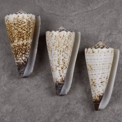 NoteGEM. A nice set of equal size from the same population and with three different colors: dark, finely patterned with triangles and white with spirals. All definitely of the subspecies “castrensis”, endemic to Palawan and quite variable. Left to Right = 54.6 / 56.5 / 56.7 mm. Philippines. Palawan. El Nido region. 10-25 m. 2011. #633398