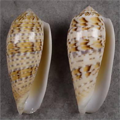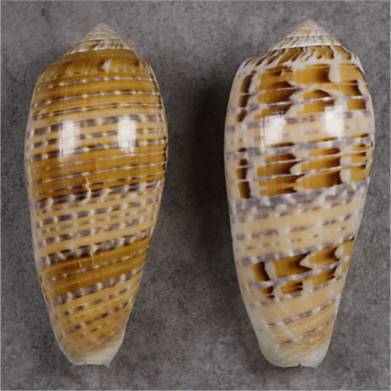 NoteF+++/GEM. Famous. We have here a set with two uncommon forms that are sought after: on the left the type with strong blue bands and dark chocolate, on the right, a piece with multiple spiral bands, dominating the pattern and general appearance of the shell. Both have been chosen out of many, both are fully adult and not with the classic “speckled base”, but superb in quality. LtR = 73.5 mm, 71.9 mm. Philippines. Balut Island. Tangle net. 50-150 m. 2012. #696816