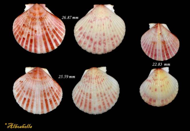 Note16523 Perapecten commutatus (Monterosato, 1875) 26,87-25,59-22,83 mm Spain PECTINIDAE F+++, set 3 items,trawled 80-150m, Malaga 4/2023