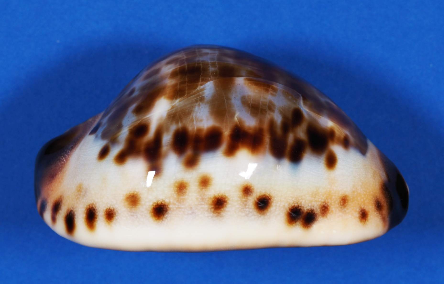NoteImpressive large shell with mottled chocolate spots highlighted by a high creamy sides bordered with intense black spots and black / gold siphon trim. It has a brown base. Collected from a geodia sponge in 98 metres of water west of Dirk Hartog Island off Shark Bay in June 2023. Graded Fine ++ due to the growth interruption on labial dorsum. Otherwise pretty gemmy. Jeaniana from this location are particularly pretty. An impressive shell with two brown spots on the upper margin of the cream callous on either side of the posterior siphon giving it a "snake eye" appearance. Started at 200 euro to allow the posting of four photos.