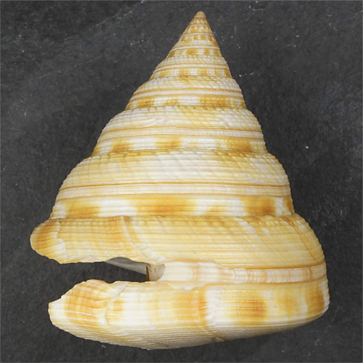 NoteF++. Remarkable Salmianus that was on display in the Conchology showroom for several years. This specimen is of good size, caught alive, and with unusual stepped shoulders. The coloration is very good, with a well-marked red line on either side of the selenizone. The opening and the start of the vent are classically damaged, although less so than usual for this species. China. East China Sea. Trawled. 200 m. #732963