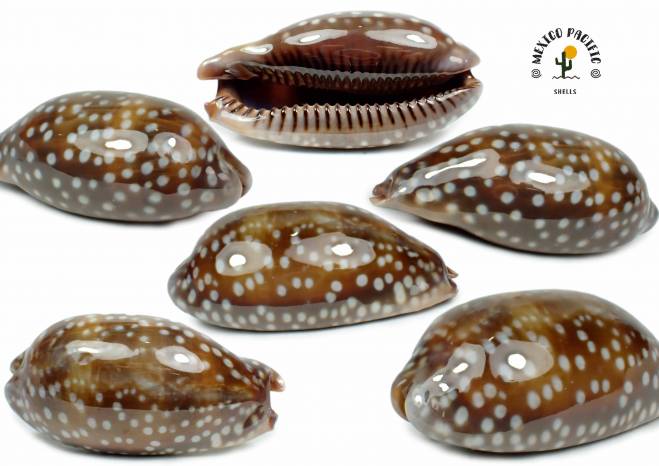 SPECIAL GLOBOSE FORM AND LARGE DENSE WHITE DOTS WOOOW!! Gorgeous large white dots pattern all around the margins with adorable effect between the brown dark cappuccino background color. Thick massive, heavy and robust beauty. Glossy great conditions. The ventral side is coming hyper gloss with serrated stripe denticles in the aperture lip and striped dark inner lip pattern spots. Really beautiful unique pattern form. Some natural imperfections are coming most not really harming this beauty. F+++. This nocturnal species are most attached under the stones during the day, the animal black-grey it assimilates a dangerous organism with very large and thick spines, truly imposing when it is actively walking. Found attached under stones with mud about 3 and 5m deep. Bahia de Piedras, Melaque, Jalisco, Mexico. January 2026. Value for this globose short form and dense marginal large white dots: 20-25 euro. MEXICO PACIFIC.