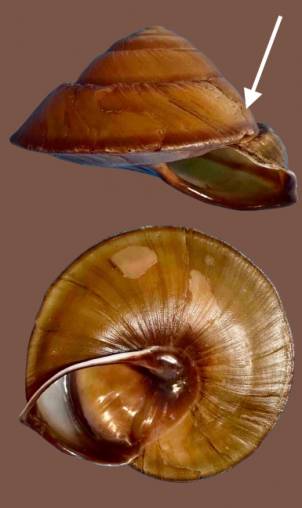 NoteSelf Collected. Under logs and fallen palm fronds in rainforest. Queensland, Tamborine Mountain, Tamborine Mountain Road. 2005. Note: Growth of shell interrupted where indicated one full whorl before aperture which has caused a step at the suture and reduction in height.