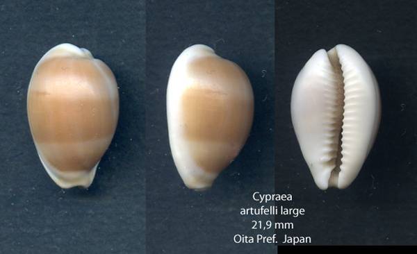 Notevery good size,found dead, with a large tan chochocolate transversal band, not shining but in good condition, white base, from Kamae, Oita Prefecture