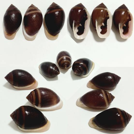 NoteF+++/GEM. Beautiful contrasting set of 3 with different dorsum colour and lip colour. All with perfect thicken lip. Found on mud in mangrove habitat, 1st March 2026.