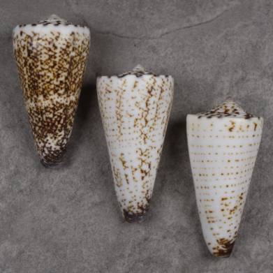 GEM. A nice set of equal size from the same population and with three different colors: dark, finely patterned with triangles and white with spirals. All definitely of the subspecies “castrensis”, endemic to Palawan and quite variable.