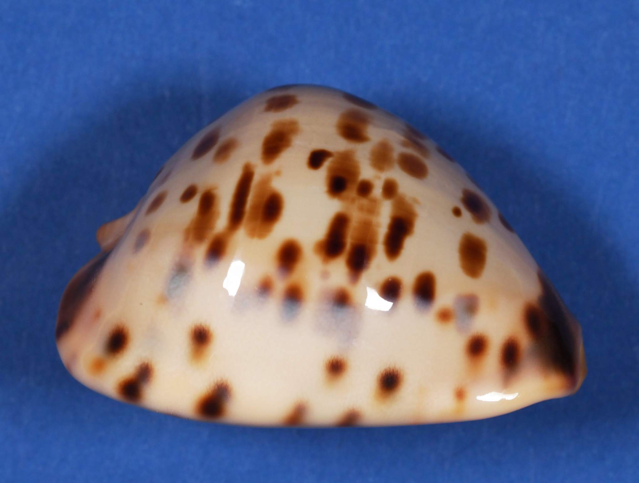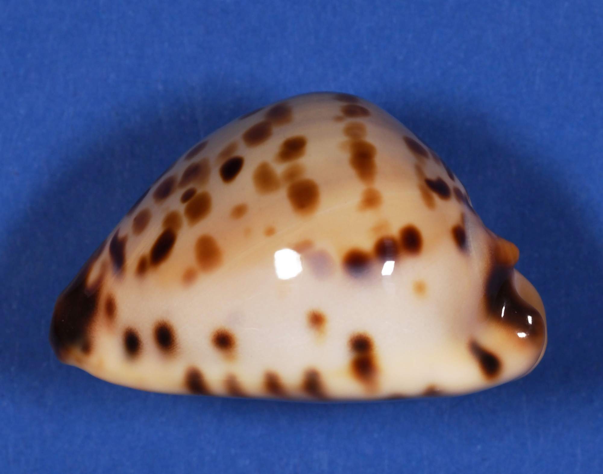 Note | Beaut specimen ROV collected from a finger sponge on silty sand with very sparse sessile growth in 85 metres of water. Found west north west of Barrow Island, Western Australia. The shell has sparse dark chocolate and tan spots on a beige dorsum, brown siphon trim and a faint apricot colored base. Originally selected for our personal collection as the dorsum exhibits horizontal bands of tan brown spots.
