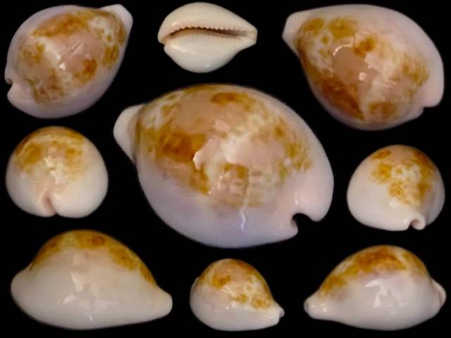 Note | Highly glazed, bulbous and exceptionally wide morphology, high calloused margins and pinkish aperture teeth characterize this specimen (19.1 mm width). The shell shows a large generous dorsal pattern characterized by indistinct lacunae and blotching. This specimens' cream/pinkish base and the large, thick, wide nude/beige lateral walls and margins are most impressive. The wonderfully colored specimen was captured by Scuba diver at 4 meters on sand/rock substrate off Port-Gentil, Cape Lopez Bay, Gabon in 4/2016. Grade: GEM. |