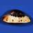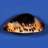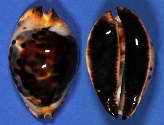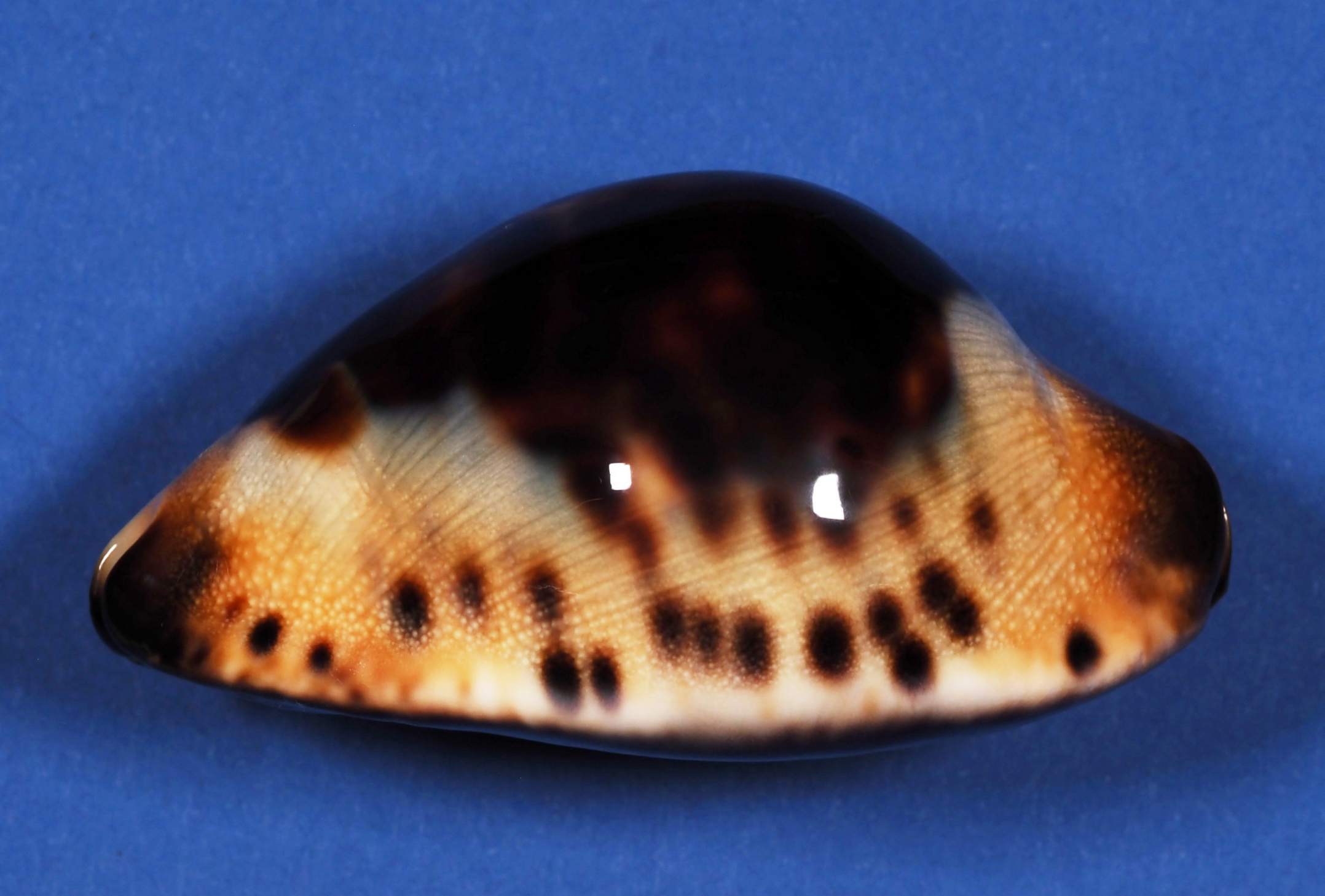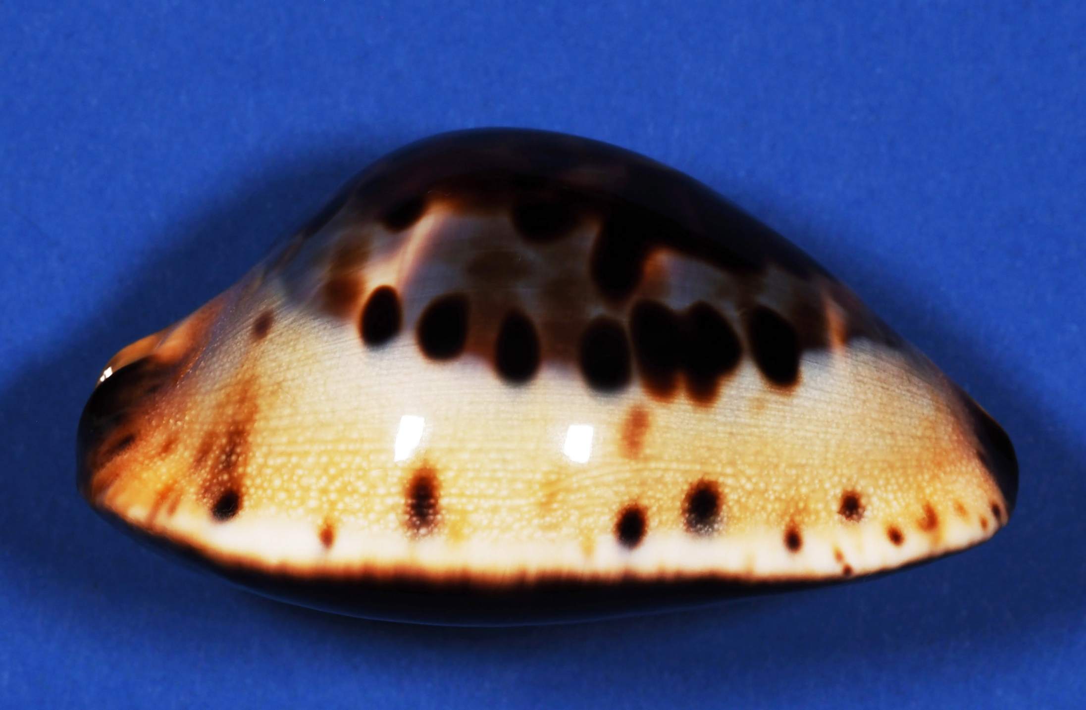 It is a beautiful shell with big dark blotches over the dorsum, exposing a blue mantle line bordered with large dark spots. The base is nearly ink black and the sides boast a creamy apricot hue, bordering the dorsum with dark golden siphons.