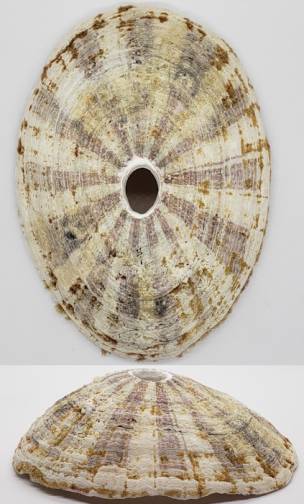 NoteOne nice live-taken and giant specimen of Fissurella maxima, the largest species of Fissurellidae. This species lives on rocks, usually near and under forests of giant Lessonia algae. Large Fissurella species in Chile are caught by fishermen, collected with hooks and almost always damaged. The dorsum of the shell is always covered by calcareous algae, vermetids, boring polychaetes and other epibionts, particularly Scurria species. It is currently difficult to obtain giant specimens over 120 mm like this one. This one was collected recently by fishermen, and it is in very good condition for the species and the size, with just a few chips in the border of the shell which explain its low initial price. The shell is very thick and the dorsum has been lightly cleaned and its shows partially the darker rays which characterize this species. The dorsum has some tiny boreholes and some old scars but it is reasonably nice, and it still have some reddish algae which can be further cleaned to reveal the nice pattern of rays. A very low initial price for a very nice and very large specimen of Fissurella.