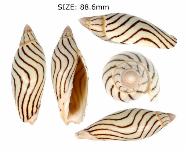 | Note | it is a very nice looking shell with a cream ivory dorsum and very nice strong dark brown regular lines forming a wave in center dorsum, on the spire lines are more thin and straight, I'll qualified this shell as a F+++ one,it got a rectified lip, trawled in Arafura Sea |