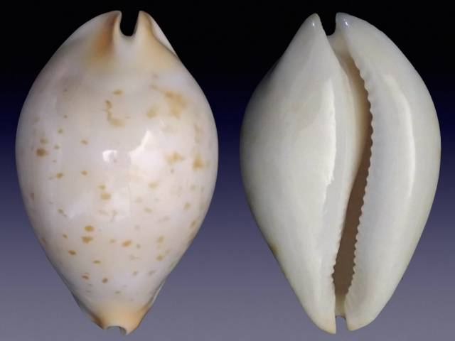 | Note | Impressive form, peach/apricot tinted extremities and wonderfully golden tan speckled dorsum. Choice example of this rare Australian deep water friendii form. Remarkable specimen with characteristic convex base, depressed inflated oval body, and rounded thick margins. The shell demonstrates perfect extremities, soft ivory pigmented dorsal primary pigmentation and a porcelain white base. Notable weight to size ratio (49.7 grs) complements this excellent cowrie. Collected by ROV at 205 meters on sandy bottom in an area of sparse sponge growth southwest of Dongara, Geraldton, Western Australia in 2/2023. The shell shows minor nacre loss and growth creases on the posterior ramp and dorsal labral side, barely visible in images. The specimen was fresh dead collected. Grade: Pretty damn nice. |