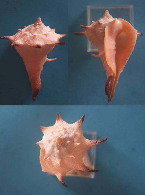 NoteF+++; fine radial ribs distinguish it from T. zanzibarica; thick lip; flaring columellar shield, protruding protoconch + shoulder spines fully intact