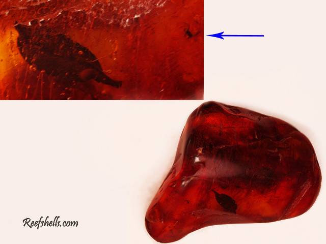 NoteVery good quality. Total size: 48,49mm. Angiosperm leaf in copal. A small insect is also fossilized.
