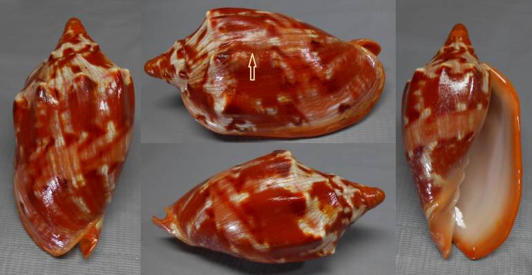 | Note | f+++ Cymbiola aulica, special fresh color rare. nice siphonal canal nice lip unfilled. has natural slight thin scar on right side see on the photo, taken by net about 100m deep from dasalan island part of mindanao.found 2025 |