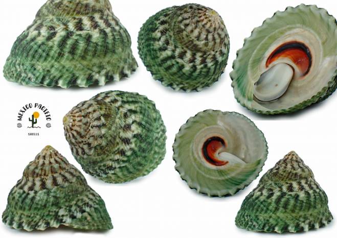 | Note | MAGNIFICENT LARGE GREAT GREEN BANDIND BEAUTY!! Look at this spotted pattern going all around the spire combined with fresh dark green. Elevated conic shape with fully pattern in the spire region. Impressive green color combined with superb sculpture and large seldom seen size. Large with 52mm high x 70.7mm wide!! The best extraordinary sculpture combined with pattern, size and extra darker dots all around with the vertical and undulated spiral ribs WOOOW!! Unique opportunity to get this unique rare species with great spire, lip, operculum, dark dots around, banded, green elegant fresh colors, very clear detailed structure and great large size. The single most striking feature is a brilliant spot of strong orange at the base of the umbilical pit which is bordered by a black outer edge, amazing!! I was looking for this species for years!! I know there are some small populations registered for Baja California Sur( La Paz + Pacific), Sinaloa (Mazatlán), Nayarit (Punta de Mita), Guerrero (Acapulco) and Oaxaca (Salina Cruz) But no In Jalisco State registered before, this is one of the first populations ever found in hundreds of kilometers of Coastline. In fact the population is only living between 50 square meters in a rocky beach, very small place, between 1 and 1.5m deep. I was so lucky to find them only because I found one fresh dead many years ago. So I was sure they are somewhere there. Seldom seen in collections and for sure in the market with so fresh deep colors, awesome sculpture and impressive conditions. Natural insignificant imperfections as usual not really detracting the beauty like light erosion and a drill hole near apex region. F++-F+++. For advancer collectors and lovers of special and rare species. Found attached on big stones about 1 to 2m deep Playa el Tecuan, Jalisco, Mexico. November 2025. Value for this really rare species endemic from Mexico with the most dense Green color you can get, striking spotted pattern and extraordinary sculpture : 85-100 euro. Good luck and Happy shelling!!! MEXICO PACIFIC. |
