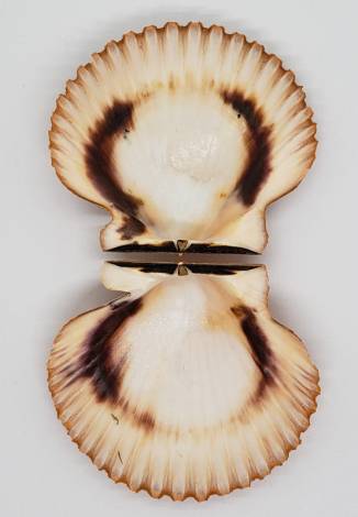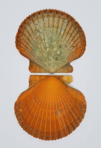 One very nice specimen of the only pectinid species found in northern Chile: Argopecten purpuratus. This one is a very rare color variety: Orange! From about 400 normal color ones you can get one orange specimen, so very hard to obtain.