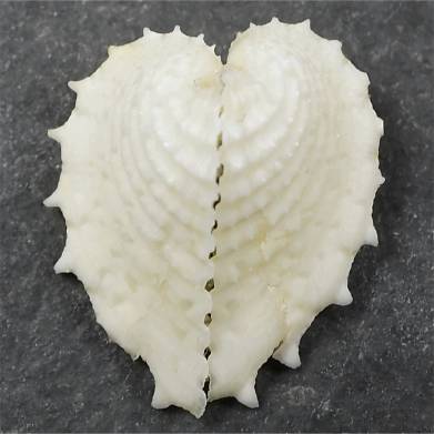 When we consult Hylleberg (2004, part 1) we see on page 106 a fine reproduction from the Conchological Illustrations of Sowerby from 1833. Later we see the shell in Reeve (1843) but he shows a single valve. And likely also single valves in Abbott and Dance (1982). Salvat and Rives show two pieces. All shells are said to come from the "Central Pacific Islands, the Pacific, Reao or Tahiti". All shells are small: between 12 and 20 mm. The present piece also fits close to the Sowerby shells, but without the red band. The texture of the shell is similar to the one seen in lorenzi, but then again different, and the spines are much more developed compared to typical cardissa.