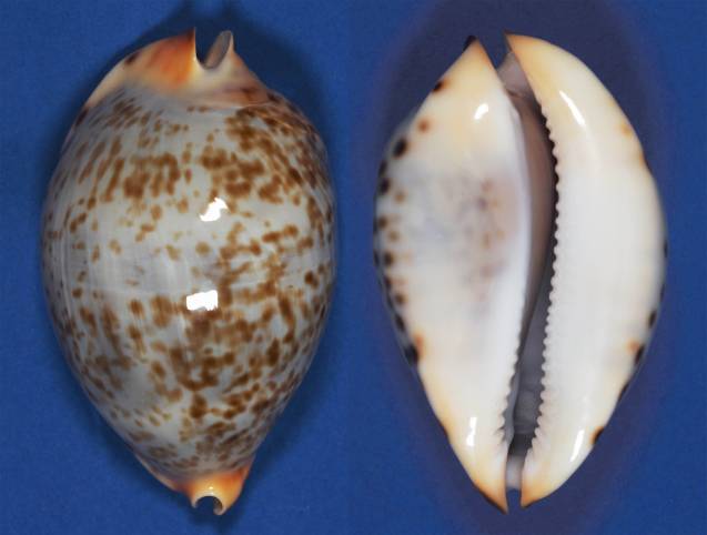 Classic lentigenosa with sparse fine tan spots on a grey/blue dorsum. It has a creamy apricot base and margins with intense black spots. Graded Fine++ as the columnar side is a little growthy. ROV collected from 96 metres of water south east of Augusta, Western Australia during October 2025. A very unique shell that we rarely come across.