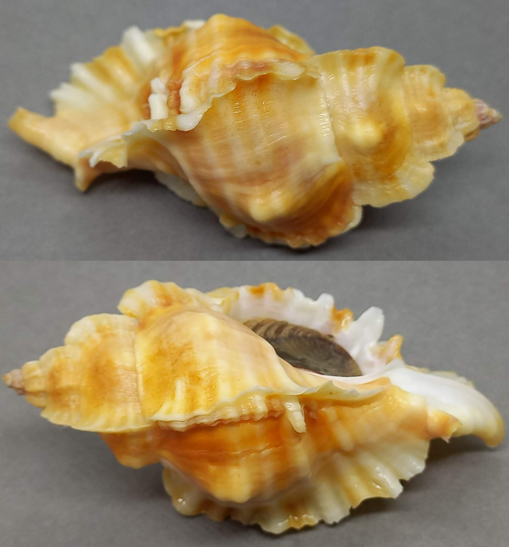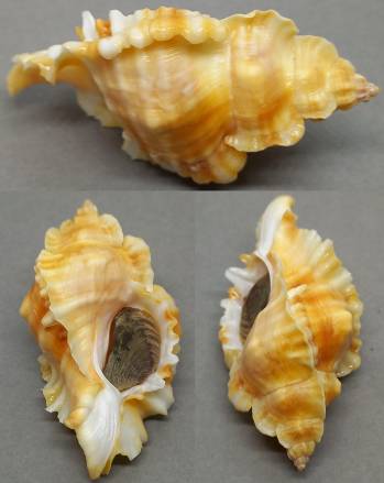 | Note | Very rare golden coloration with nice orange stripes. Nice, fresh, fully mature, colorful shell with beautiful wings and nice syphon. A little worn on apex, otherwise Gem . F+++. Collected in Posiet Bay, South off Vladivostok, 30 km. from North Korean border. SCUBA diving at 15 meters on oyster bed, 2025 |