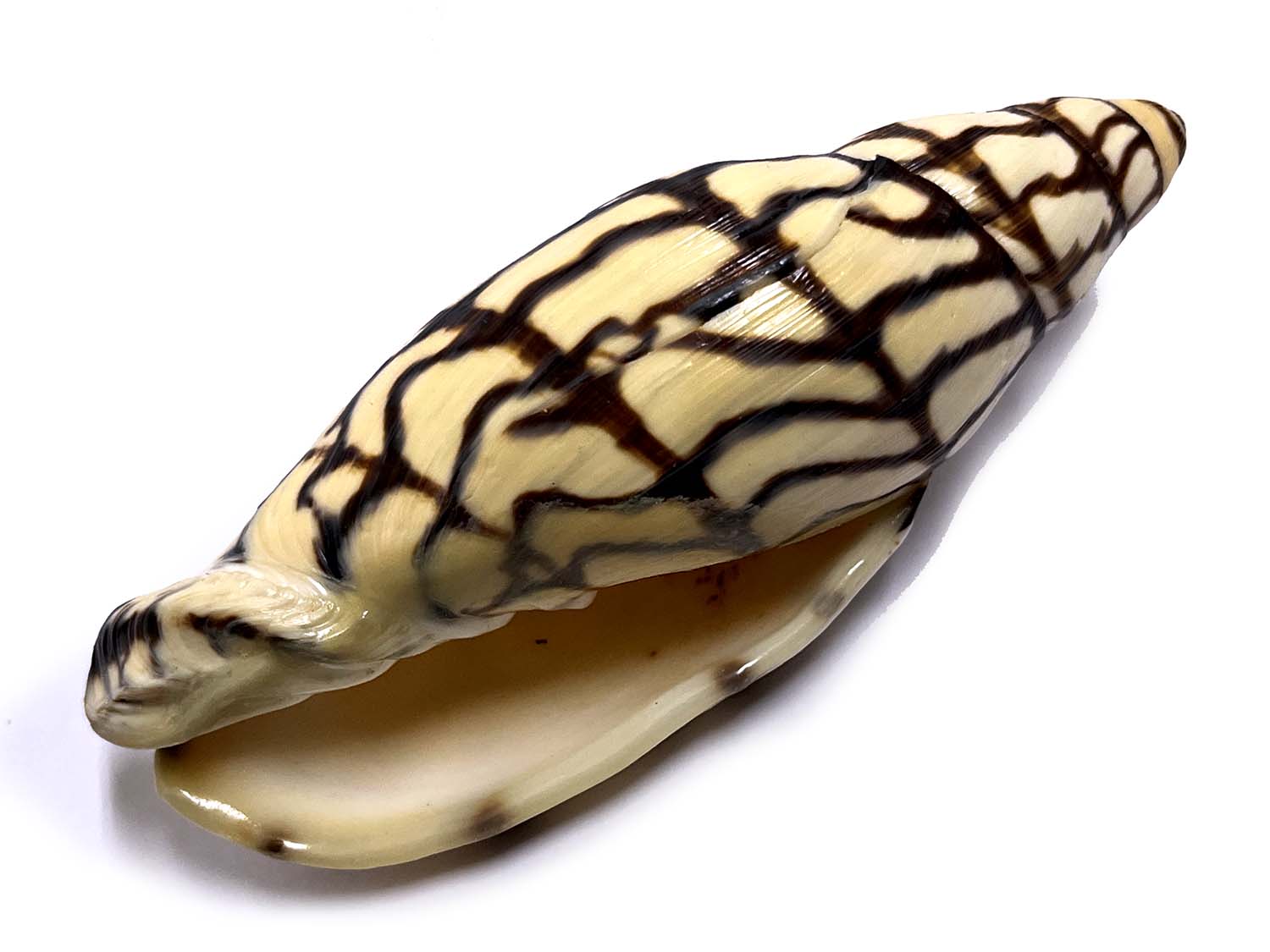 | Note | JMM 048 - Volutoconus bednalli (Brazier, J., 1878) ONE OF THE BIGGEST GIANTS WITH ELONGATED SPIRE & BODY WHORL! 143.00+ mm, WITH EXCEPTIONAL PATTERNS!, F++ and 100% natural, few chip, natural scars, here and there, thick glassy lips, long curved-up tail wow!! It could be cleaned further, we only cleaned it once with pure water and no chemical since it's a historic specimen of Thai Fisheries in Arafura Sea more than 30 years ago, so we keep it as we received it from our contacts, AMAZING PATTERNS OVERALL!, THE ONE AND ONLY! *** WE ONCE HAD IT ON OUR MUSEUM'S DISPLAY, NOW THE CHANCE IS HERE FOR ALL OF YOU! *** collected by old thai trawling boats (mid 90's) offshore at 80.00 - 100.00 meters deep off Arafura Sea, N.W. Australia.