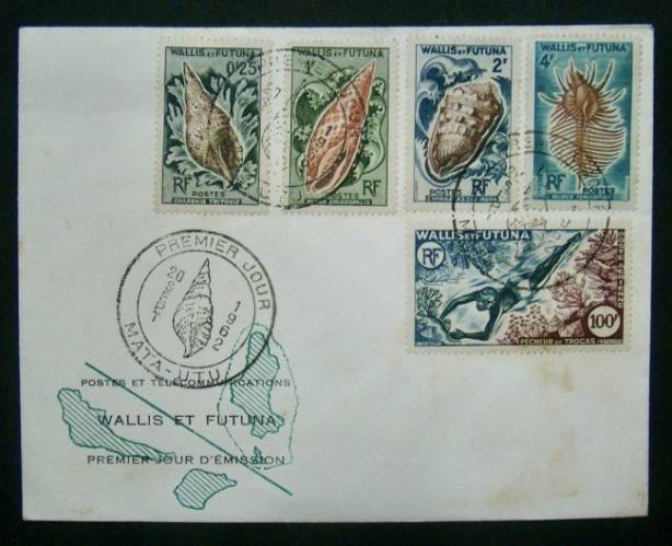 Charonia Tritonis , Mitra Episcopalis , Cypraea cassis Rufa , Murex Tenuispina & Extra Rare Diver Stamp 100F - Fist Day Enveloppe Quality : F++/F+++ >> Very Good Condition ( Condition of use ; see photos ) ; FIRST DAY OF SEPTEMBER 1962 // WALLIS et FUTUNA ( POST-OFFICE OF MATA-UTU ) . EXTRA RARE ENVELOPE . CATALOG VALUE 2018 : !!! euros . ONLY ONE IN STOCK .