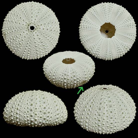 | Note | F+++/GEM. Huge size exceeding 100mm! Very thick and heavy specimen with nice greenish colour. Apical disc intact and all 5 auricles are fully intact and in perfect condition. It has a small natural depressed area on one ambulacrum (see green arrow) but does not distract its beauty. Found amongst rock boulders at surge zone, 28 Jan 1993. |