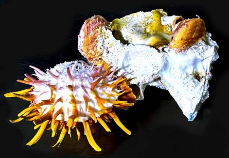 XFB 45 - Spondylus sp. FROM THE LATE 90'S (different from known species in all books! Some with rare purple, reddish orange, yellow, light brown or even pink spines on white body, some bi-color on both valves!) THIS LOT HAS BEEN KEPT IN THE ORIGINAL CONDITION FOR MORE THAN 25 YEARS AND JUST CLEANED ONE-BY-ONE A FEW DAYS AGO !!! size is approximately 126.60 mm (measured at maximum dimension across the shell & attachment altogether), shells are F++ and better, in general, please see photos, collected by local divers offshore at 15 - 20 meters deep off Racha & Maiton Is., Thailand, Andaman Sea. EX : COLL - Jom Patamakanthin. (***There can be tiny imperfections, scars, damages as natural objects, please bids with your decision & confidence.) Estimated value between 50.00 - 100.00+ euros for such museum-class specimen!