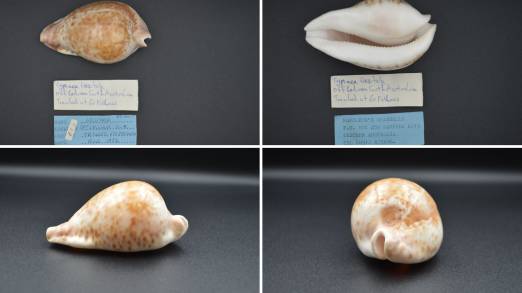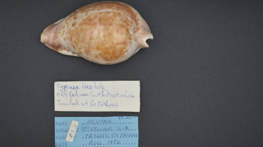 NoteA magnificent, large-sized specimen of Umbilia hesitata from a private collection established between the 1950s and 2010. Trawled at 60 fathoms off Ceduna in August 1984. This specimen carries significant provenance and high value, accompanied by two original data labels, including the authentic tag from the renowned "Napoleon's Seashells" (Dampier, W.A.). At 98.01mm, it is an impressive, near-trophy sized example of the species. The shell exhibits a superb high-gloss dorsum with rich orange-brown spotting over a creamy-white base. Weight: 77.0g. Grade: F+++/GEM. Note: Photos are unedited and captured with a Nikon D3200 camera using an AF-S DX NIKKOR 18-55mm f/3.5-5.6G VR lens.Please feel free to request additional photos if desired, as the resolution here is limited. High-Resolution Photos: For a detailed, high-definition view of the shell's texture and patterns, please visit the following link: https://drive.google.com/drive/folders/1LCWXBqLFGEwJpZWOGhGbPLHCds8mQ1r2?usp=sharing