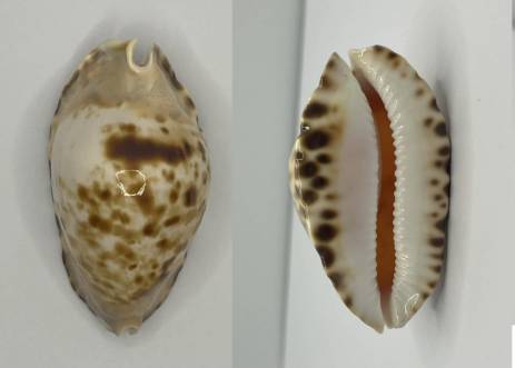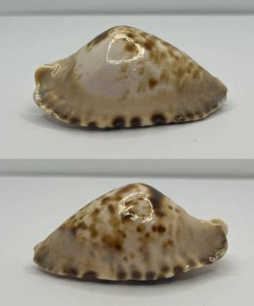 A lovely classic spotted pattern with a nice BLACK BLOTCH on the dorsum makes for a lovely looking shell. If not for the flaws this would be a magnificent shell but unfortunately there is several issues. F+ with obvious chips and regrowths on both canals and a reglazed fish bite on the dorsum. Collected in cave at 14m. Garden Island