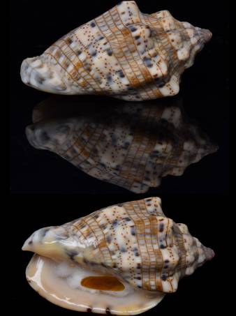 | Note | Arashi, Aruba, dived 3-6 meters, under rocks, in sand. Voluta caquetio is a newly described species from Aruba (accepted by WoRMS), previously identified as Voluta musica. It differs by its broader shape, higher protoconch, more columellar folds, and a paler shell with stronger, high-contrast banding. Endemic to Aruba. This specimen shows a pattern of brown axial bands with fine net like lines and scattered dark blotches. Grade: (F+++). This auction, I will be posting exclusively Caribbean specimens, mostly from Aruba. The next auction will feature a broader range of shells from various locations. |