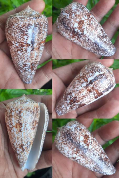 Conus abbas This is a sea snail of the genus Conus. It is elongated and cone-shaped with a distinctive brown and white bark pattern. Its surface has a distinctive texture with an attractive mesh or woven pattern. (F+++)