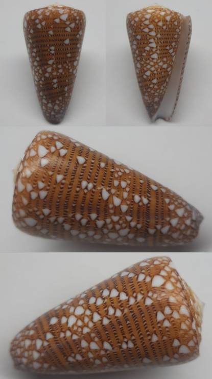 NoteConus yaelae A shell with a distinctive conical shape, its golden brown base color is accentuated by a pattern of tiny white dots neatly arranged like pearl flakes. Beneath the dots are fine lines that form an attractive woven pattern. Its glossy surface gives it a simple, elegant impression. (F+++)