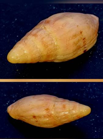 F+ Collected in moderate deep water by a cray fisherman off Gerakton WA this Recently described Notovoluta stricklandi is on offer. It's a crabbed shell and has a nasty lip/tail break but displays ok from dorsal and side shots. But probably first of this named species on offer to shell auction.