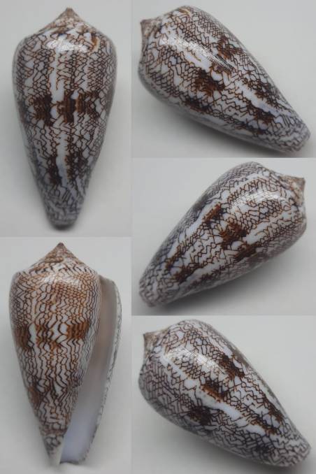 Conus abbas This is a sea snail of the genus Conus. It is elongated and cone-shaped with a distinctive brown and white bark pattern. Its surface has a distinctive texture with an attractive mesh or woven pattern. (F++)