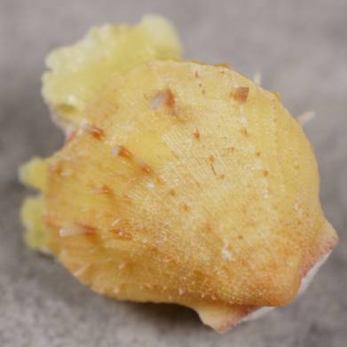 DEFORGES HIS SPONDYLUS: FROM THE DEPTHS IN BRIGHT YELLOW. A deep-water species of Spondylus in a very unusual colour: bright lemon yellow with red spines and a red umbrella. A classic colour pattern that is not often seen. The yellow deforgesi is a collector's nightmare, as it is really rare in this colouration.