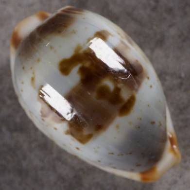 GEM. GREENISH-BLUES AND BROWNS IN A NICE COMBINATION, AN ENDEMIC FROM THE HORN OF AFRICA. This shell is well sized, absolutely perfect and the browns mixed with the blue green in different shades is stunning. The contrast of the orange-brown spots on top and base add to the attractive features of this cowry with strong teeth on the base all over.