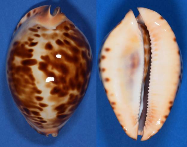 NoteAn attractive jeaniana collected from a geodia sponge in 95 metres of water south west of False Entrance off Shark Bay. The shell has heavy tan spots on a cream background with an wide mantle line and an apricot cream base with matching siphons. It has cream margins with strong brown spots. A slender and pretty shell. A true Gem and a rare colour form !!!