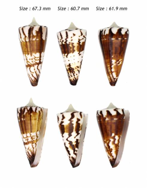 Notevery nice set of 3 different shells, very nice looking pattern, tan brown chocolate coloration, F+++, lip slightly rectified, from Olango Is, price is for the set, these shells will be sent from Philippines