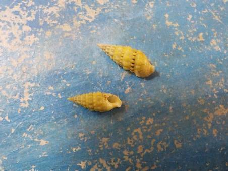 2 superb yellow cerithium sp. 17.97 mm , 14.88 mm , Messologgi lagoon , Greece.