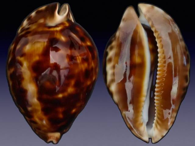 | Note | Rare vercoi specimen with an impressive an extraordinary dorsal pattern and mixed lateral wall spotting. The shell features an intense black/brown maculae-based huge blotch covering the entire columellar dorsum with a magnificent dorsal line.. The specimen also exhibits a strong nacre gloss accentuated by the caramel/chocolate pigmented extremities.The vercoi displays intense compacted macro-spotting on both lateral walls/margins. A sight to hold in hand, especially with the multi- brown colored and heavily glazed base. Super shape/symmetry with notable inflation with moderate rostration present on the anterior extremity. Collected by famed Scuba diver Peter Clarkson at 42 meters at the base of a purple ridge sponge on a granite plateau off Termination Island, Recherche Archipelago, Esperance, Western Australia in 4/1995. Original data slip from Peter included. The specimen was featured and illustrated in the textbook Australia's Spectacular Cowries, Plate 91a. The shell has a glazed shallow wobble on the posterior ramp and a micro-fleck on anterior columellar extremity. Grade: F+++/GEM. |