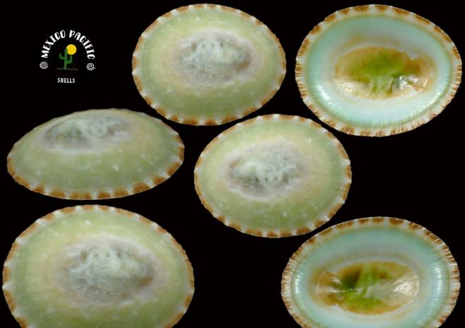 | Note | LOTTIIDAE - Lottia mesoleuca (Menke, 1851). SPECIAL UNIQUE GREEN PISTACHIO VENTRAL COLOR WOOOOW!! One of the most elegant color form with unusual Green pistachio color between the brown-white spotted ring lip. Astounding ventral color combinations. The dorsal side shows a dense elegant erosion on top changing the colors of white - yellowish, green and finally brown ring lip with elegant white multiple tents. Rare to get so green colors and really beautiful even there is usual erosion on top. F+++-F++. This is the highest selected and seldom seen conditions you can get for the species with extremely strong and vivid exotic colors. Apparently feeding on the marine soup that comes and goes with the currents, waves and seaweeds attached to the smooth stones, this species lives where the waves break and in the intertidal zone. Really hard to remove from stones without braking them. Found attached to the rocks with green and brown algae at extremely low tide. Playa Punta Negra, Puerto Vallarta, Bahia de Banderas, Jalisco, Mexico. August 2025. Value for this exotic color combination and pattern: 27-30 euro. Good luck and Happy shelling!!! MEXICO PACIFIC |