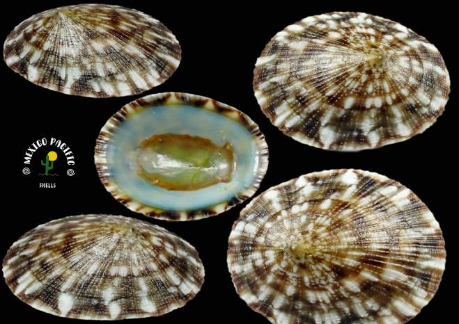 | Note | LOTTIIDAE - Lottia stanfordiana (Berry, 1957). DARK BROWN WITH WHITE DENSE AND MULTIPLE TENTS PATTERN!! Gorgeous dark Brown background colors with exceptional multiple white radial spots-lines-tents all around making a great effect between. Unique pattern and colors combination. Fantastic shinny Green bluish ventral background color with special yellowish spotted lip tents and dark ring. This is the highest selected and seldom seen conditions you can get for the species with extremely intact and excellent natural quality. With multiple axial ribs all around combined with dark brown color and white large and micro spots, really exquisite. Really hard to get so intact and so beautiful. The Apparently feeding on the marine soup that comes and goes with the currents, waves and seaweeds attached to the smooth stones, this species lives where the waves break and in the intertidal zone. Really hard to remove from stones without braking them. Found attached to the rocks with green and brown algae at extremely low tide. Playa El Tecuan, Jalisco, Mexico. October 2025. Value for this unique brown with dense white tents pattern combined with ventral bluish -brown and yellowish pattern-color combiantion : 22-25 euro. Good luck and Happy shelling!!! MEXICO PACIFIC |